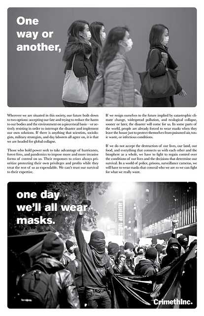 If we do not accept the destruction of our lives, our land, our food, and everything that connects us with each other and the biosphere as a whole, we have to fight to regain control over the conditions of our lives and the decisions that determine our survival. In a world of police, prisons, surveillance cameras, we will have to wear masks that conceal who we are so we can fight for what we really want.