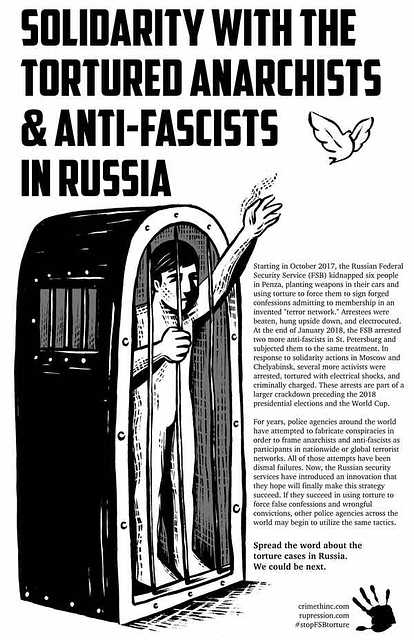 Starting in October 2017, the Russian Federal Security Service (FSB) kidnapped six people in Penza, planting weapons in their cars and using torture to force them to sign forged confessions admitting to membership in an invented “terror network.” Arrestees were beaten, hung upside down, and electrocuted. At the end of January 2018, two more antifascists were arrest in St. Petersburg and subjected to the same treatment. In response to solidarity actions in Moscow and Chelyabinsk, additional activists have been arrested, tortured with electrical shocks, and criminally charged. These arrests are part of a larger crackdown proceeding the 2018 presidential elections and the World Cup.