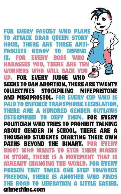 For every fascist who plans to attack drag queen story hour, there are three anti-fascists ready to defend it. For every boss who harasses you, there are ten workers who will back you up. For every judge who seeks to ban abortion, there are twenty collectives stockpiling Mifepristone and Misoprostol. For every cop who is paid to enforce transphobic legislation, there are a hundred gender outlaws determined to defy them. For every politician who tries to prohibit talking about gender in school, there are a thousand students charting their own paths beyond the binary. For every bigot who wants to etch their biases in stone, there is a movement that is already changing the world. For every person that takes one step towards freedom, there is another who finds the road to liberation a little easier.